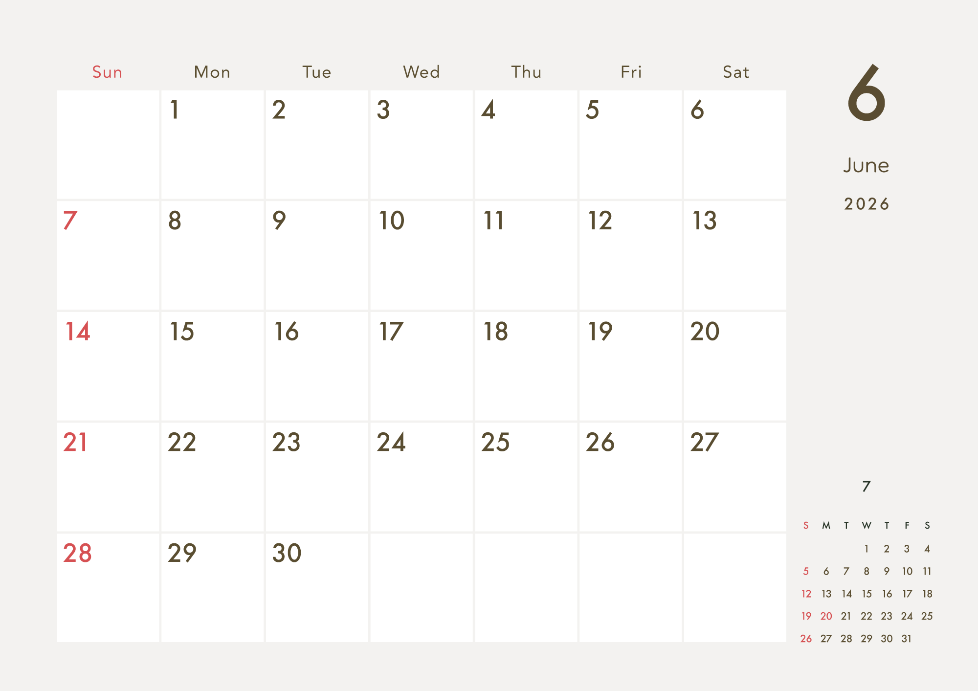 ・2026年1-12月、日曜始まり